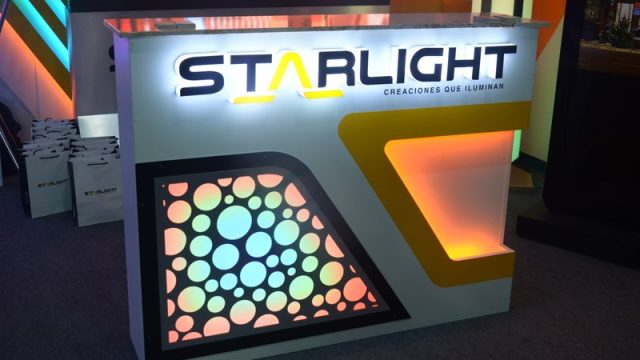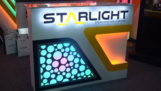 Para esta ocasión, Starlight presentó nuevas creaciones que sirven como base para el diseño y desarrollo de cada local con el que se desarrollan los contratos. Entre otras novedades, se mostró un tótem con monitor táctil para transmitir contenidos. Un elemento publicitario que es cada vez más utilizado en centros comerciales en nuestro medio. Asimismo, diversos muebles para Caja y Bar, con decoración en sistema LED digital, con cambio en la secuencia de colores. También, una columna decorativa con pantalla LED curva para la emisión de contenidos.